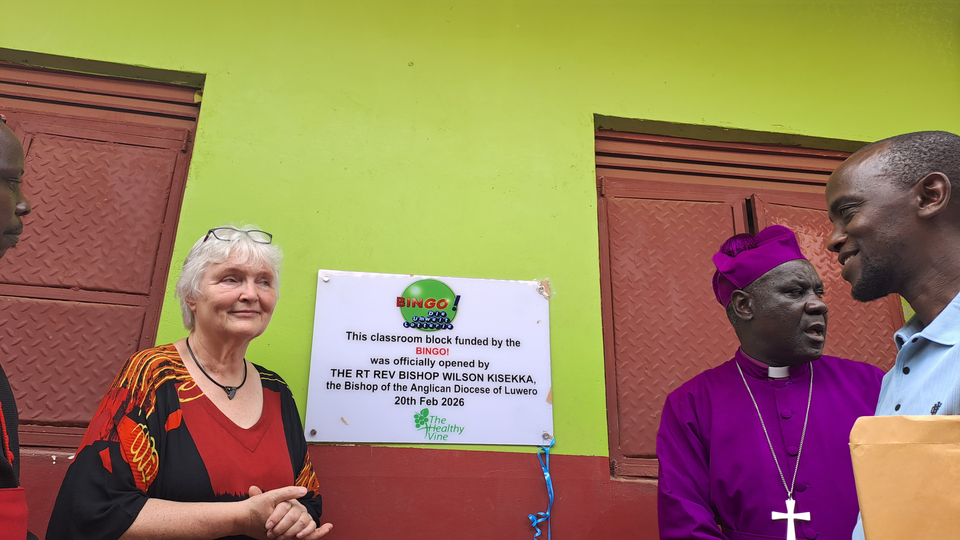 Nach den offiziellen Reden begleiten uns Trommeln und Gesänge aus dem Schulgebäude hinaus. Vor der großen Plakette, die anlässlich dieses Tages angebracht wurde, werde ich erneut gebeten, einige Worte zu BINGO! – dem Hauptsponsor – sowie zu unserem Verein zu sagen, bevor der Bischof das Band durchschneidet.