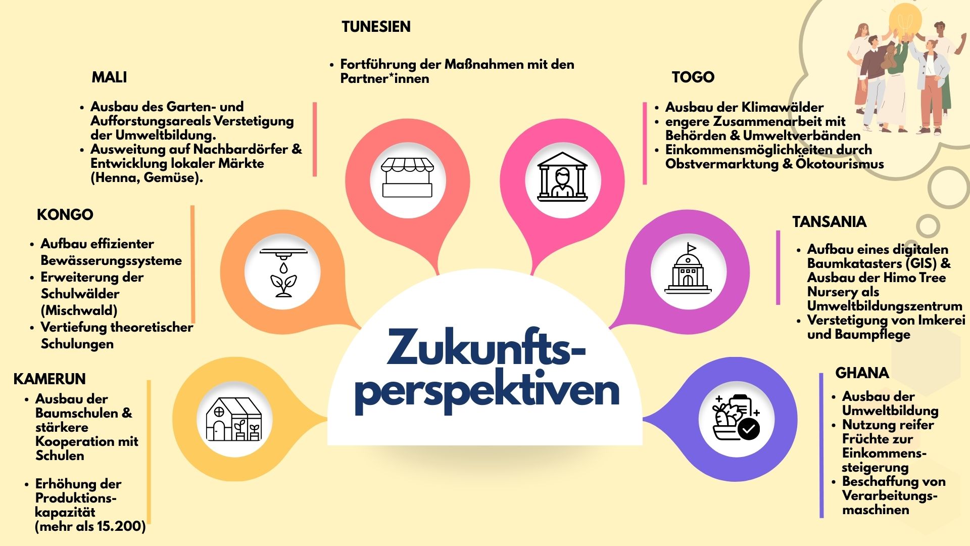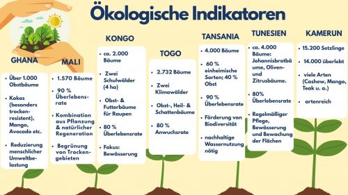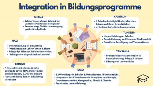 In der Demokratischen Republik Kongo entstanden zwei Schulwälder in Kinshasa. In Tansania wurden über 4.000 Bäume an 20 Standorten gepflanzt und mit Umweltbildungsmaßnahmen sowie Imkerei kombiniert. In Ghana wurden Schulgärten angelegt, die langfristig Ernährungssicherheit und Einkommensmöglichkeiten stärken.